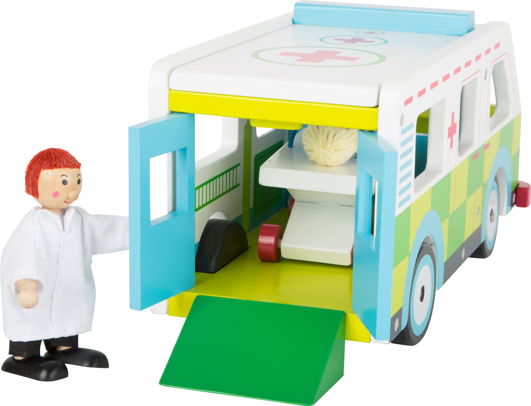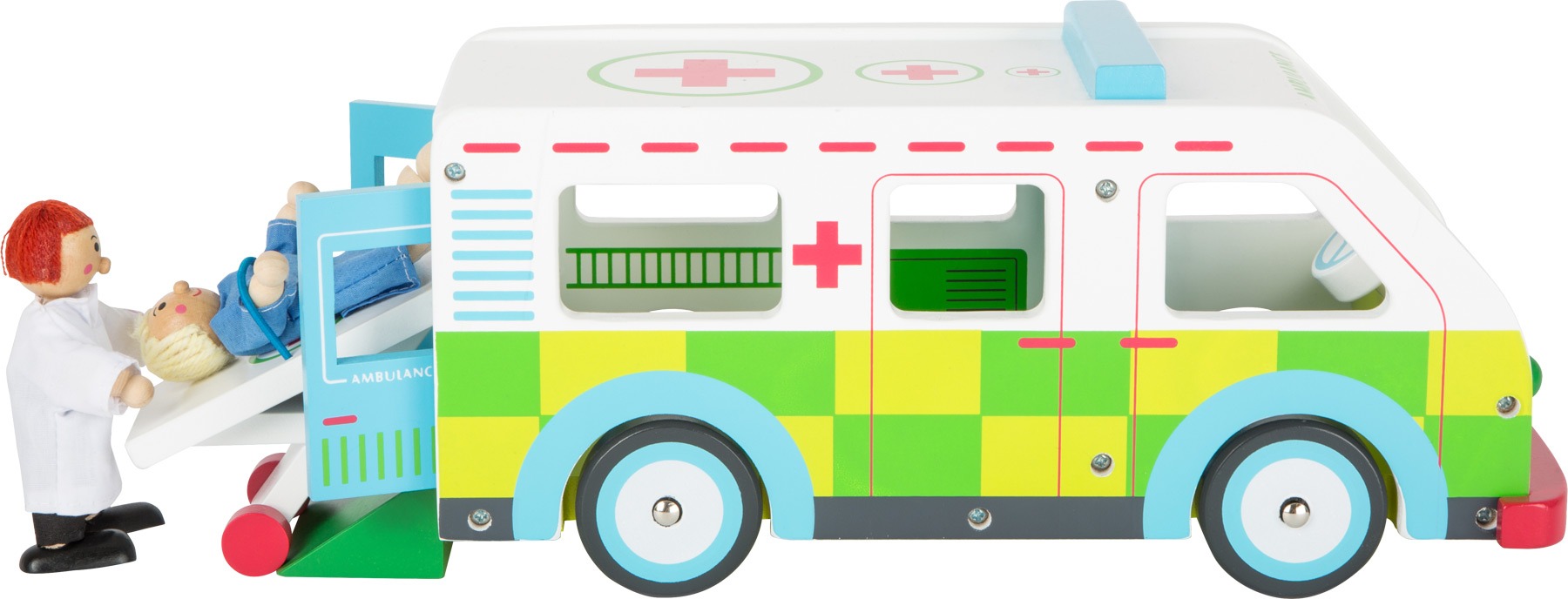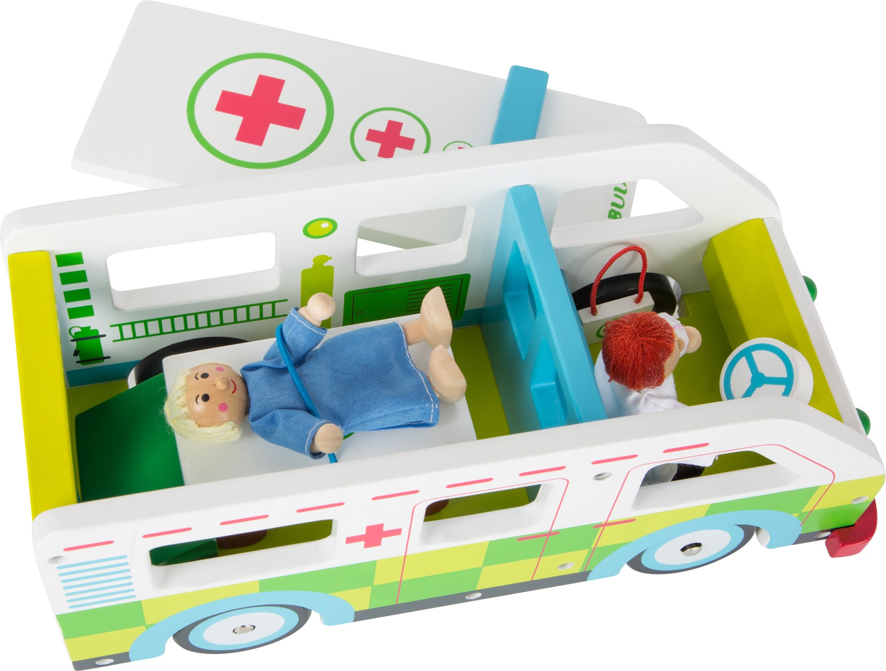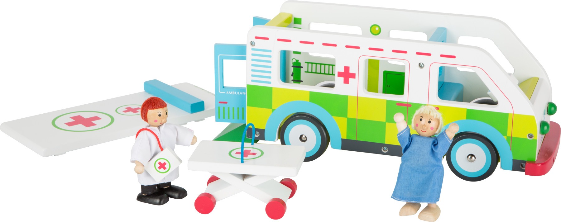 Pimpon pimpon, l’ambulance arrive! Grâce à son toit amovible et à ses portes qui s’ouvrent à l’arrière, ce véhicule d’intervention en bois solide est très pratique pour jouer. Chaque enfant peut devenir un ambulancier dans sa propre chambre d’enfant. Avec cette ambulance compacte en bois le docteur file vers le prochain lieu d’intervention. Pendant le trajet, tous les patients se sentent en sécurité sur le brancard roulant. Le toit amovible permet de jouer dans le véhicule d’en haut. Avec la rampe magnétique, le brancard est facile à sortir. Ici, l’amusement est garanti…