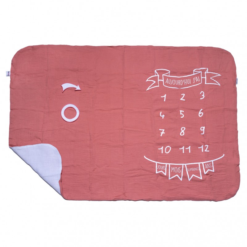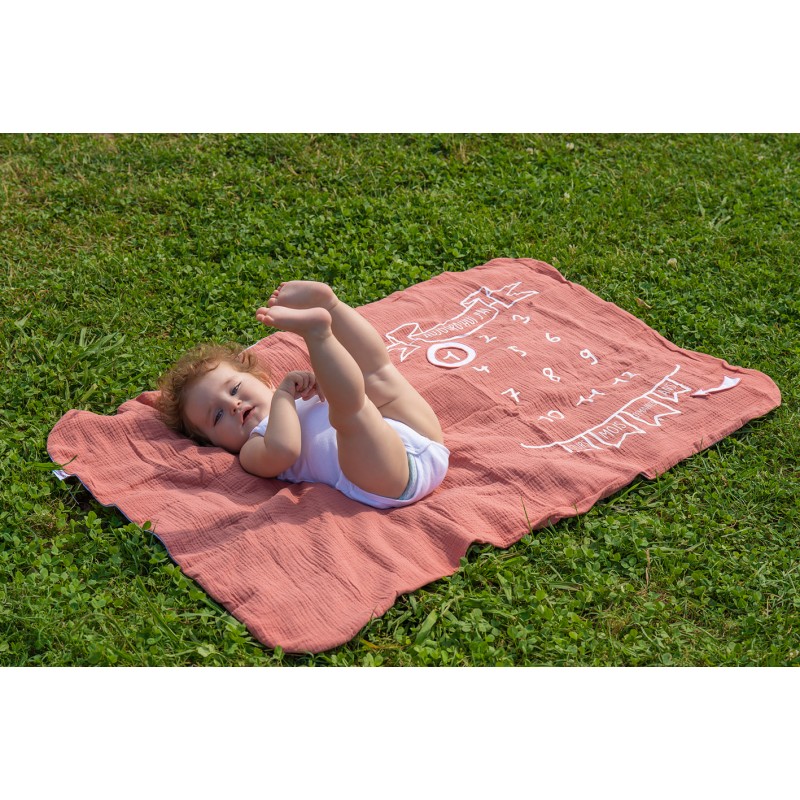 Composée de deux couches de double gaze de coton, la couverture magique de BB&Co offre deux utilisations : côté pile, c’est un joli plaid léger pour bébé, côté face, c’est un décor pour prendre bébé en photo à chaque étape de son développement !