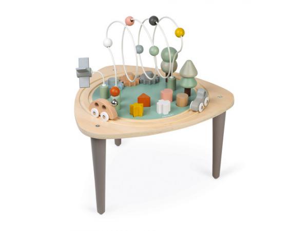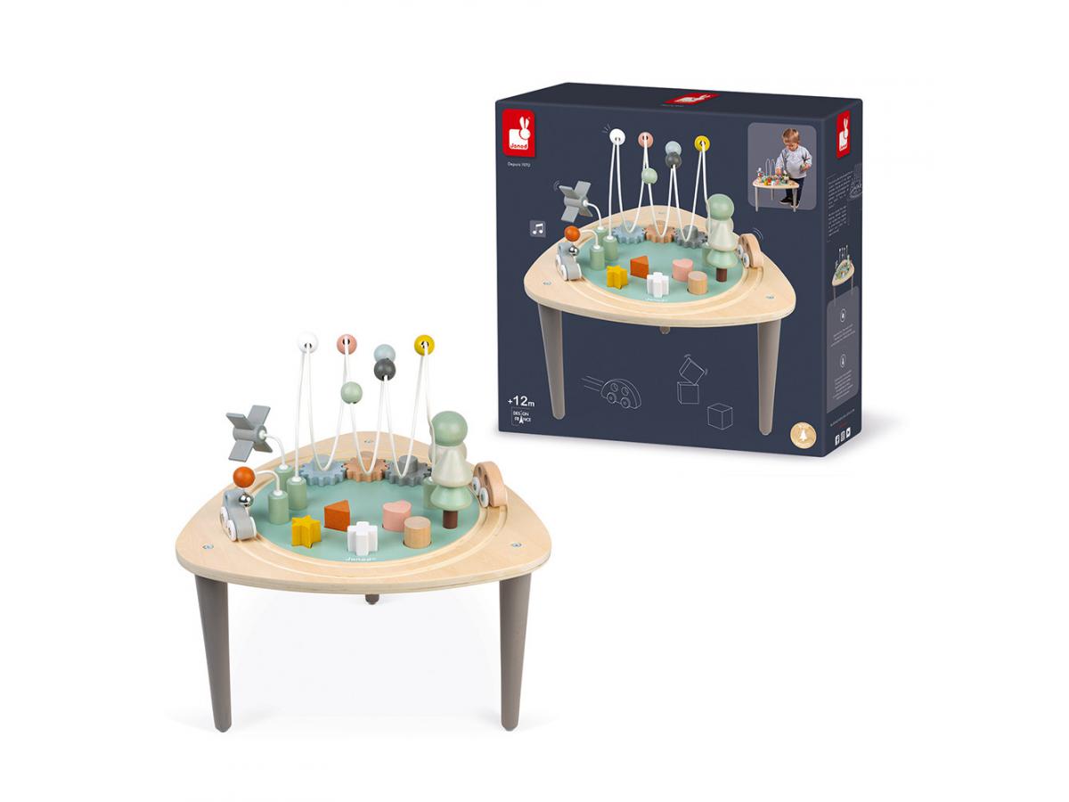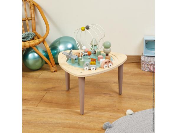 Est-ce que vous avez des petits curieux à la maison ? Si oui, voici le jouet idéal pour satisfaire toutes les envies de découvertes et tous les besoins de manipulation ! Avec cette jolie table multi-activités en bois, bébé sera comblé ! Par sa taille et par les jeux proposés, elle est parfaitement adaptée aux tout-petits ! On y retrouve un concentré de leurs activités préférées : – un rail de train circulaire avec 2 véhicules – 2 arbres à empiler – 3 loopings avec billes, moulin et clochette – 3 engrenages à faire tourner – 5 formes à encastrer Avec des pieds anti-dérapants pour plus de stabilité. Hauteur du plateau : 26,5 cm Une gamme aux couleurs délicates et aux lignes arrondies, inspirée des tendances actuelles pour accompagner les premiers apprentissages de votre enfant tout en douceur !