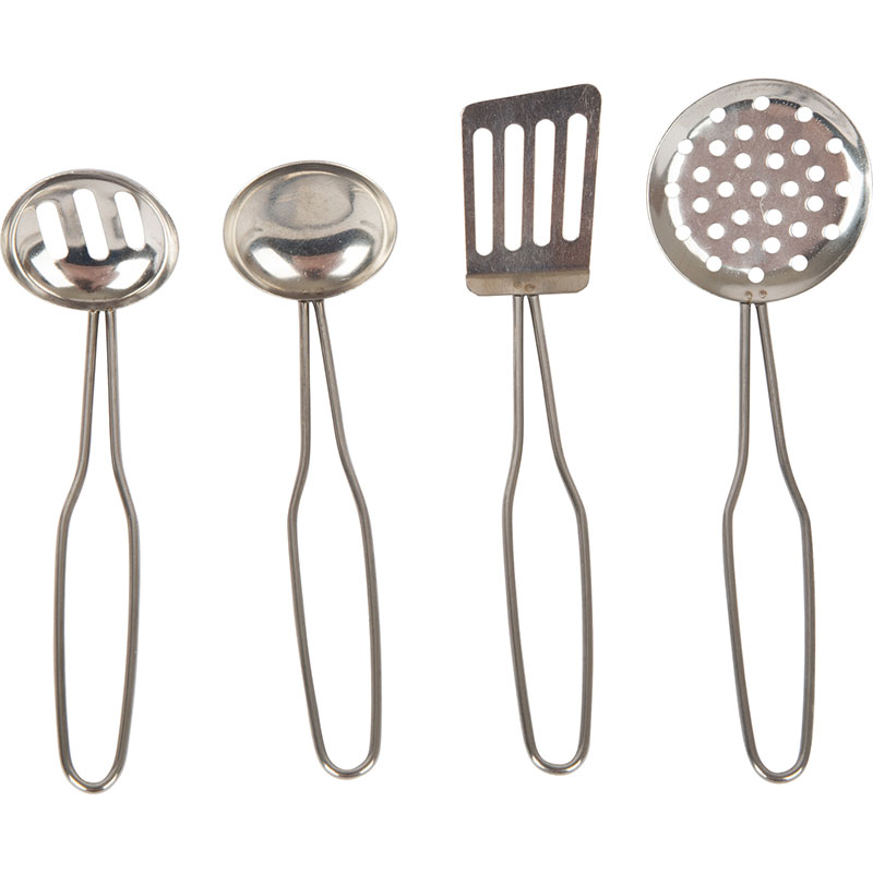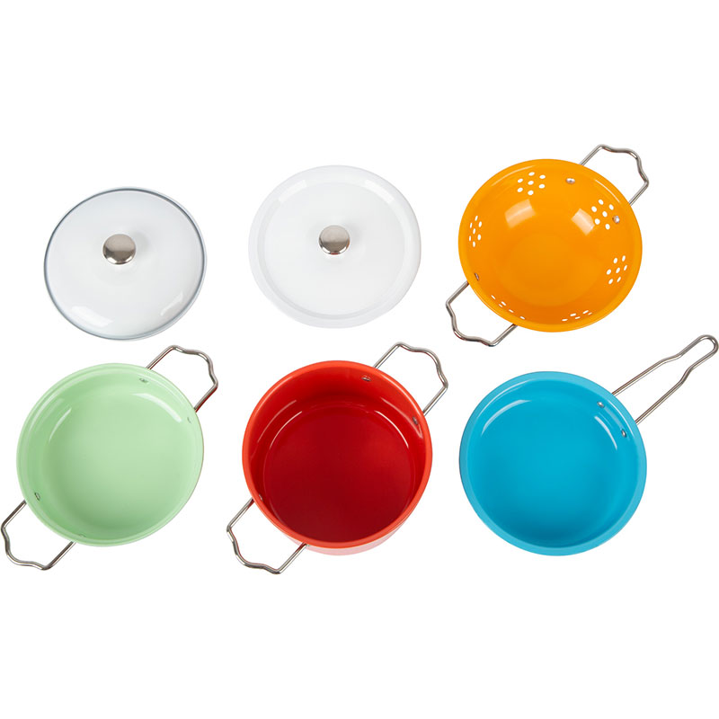 Aux fourneaux! Cet ensemble de batterie de cuisine réaliste, composé d’une poêle, de deux casseroles à couvercle amovible, d’une passoire, d’une spatule, d’une louche, d’une cuillère de cuisson, d’une cuillère à fente et d’une cuillère à égoutter en métal, convainc par ses couleurs tendance et inspire les petits chefs étoilés à créer des plats délicieux. Cela rend la cuisine des enfants encore plus amusante. En jouant avec cet ensemble d’accessoires de cuisine colorés, on encourage les jeux de rôle et la motricité. Particulièrement pratique : les couvercles des casseroles sont compatibles avec la poêle à frire.
