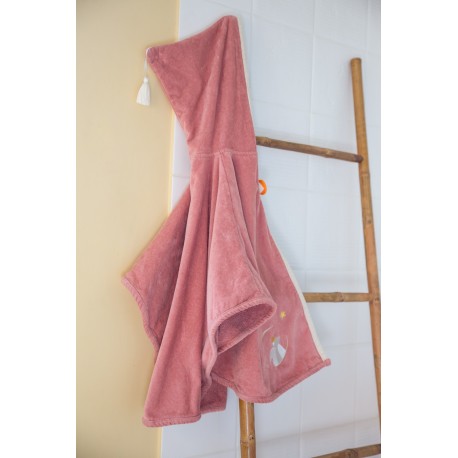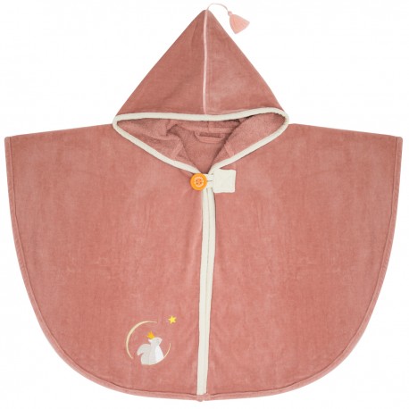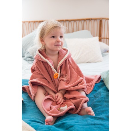 Adorable cape de bain en velours éponge OEKO TEX avec sa capuche pour être bien au sec et bien au chaud en sortant du bain.