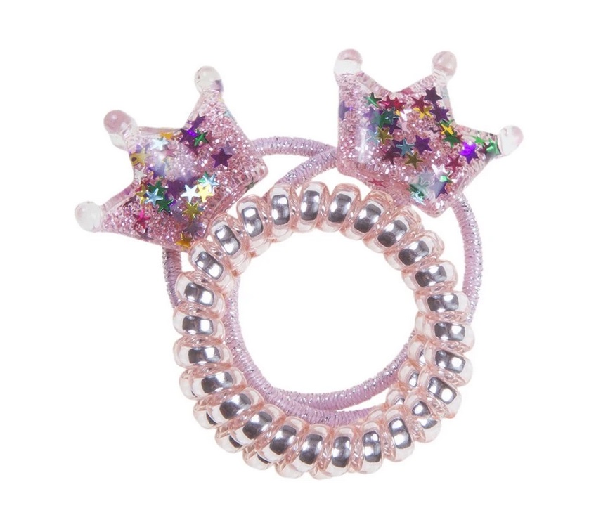 Cet ensemble de 4 pièces comprend 2 liens élastiques pour les cheveux avec des pendentifs diadèmes ornés de paillettes multicolores et d’étoiles. Les deux autres liens torsadés sont parfaits pour les cheveux des petits ou servent de bracelets.
