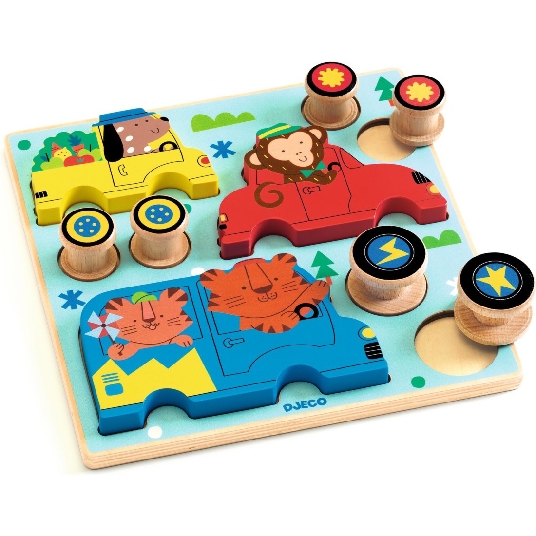 Un superbe puzzle de 9 pièces permettant de réaliser 3 véhicules qui roulent. L’enfant assemble les roues à l’animal de la même couleur et les fait rouler. Il jouera ensuite à tout replacer sur le socle, puis à recommencer!