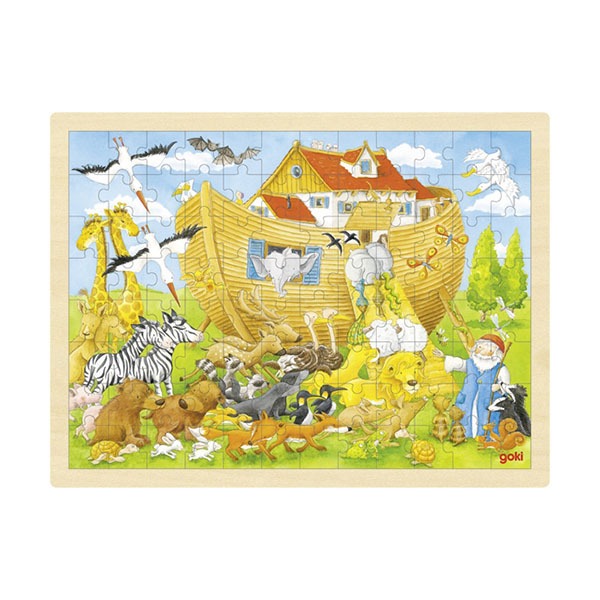 Lorsque l’on a reconstitué ce puzzle de 96 pièces dans le cadre en bois, apparaissent Noé et tous les animaux prêts à embarquer dans l’Arche.