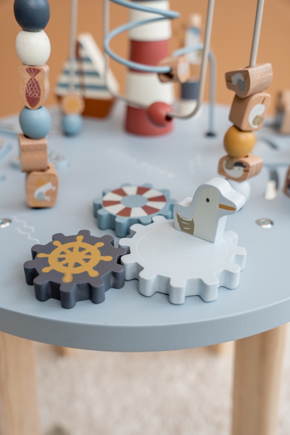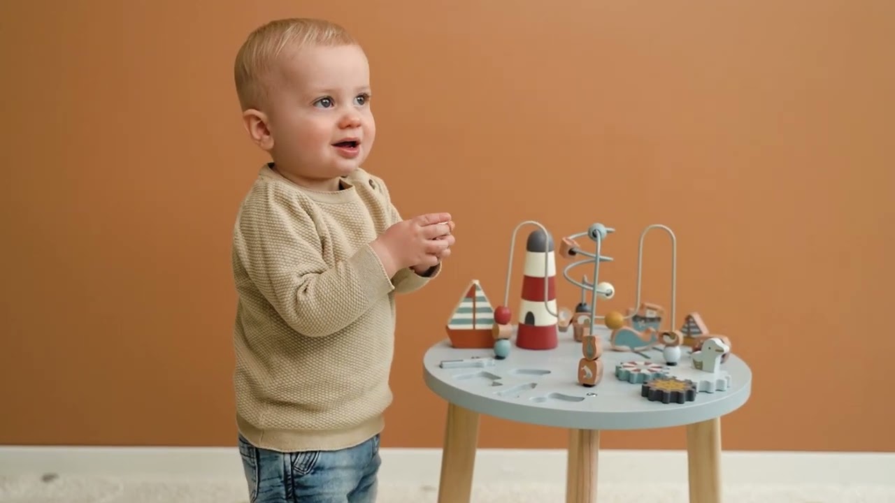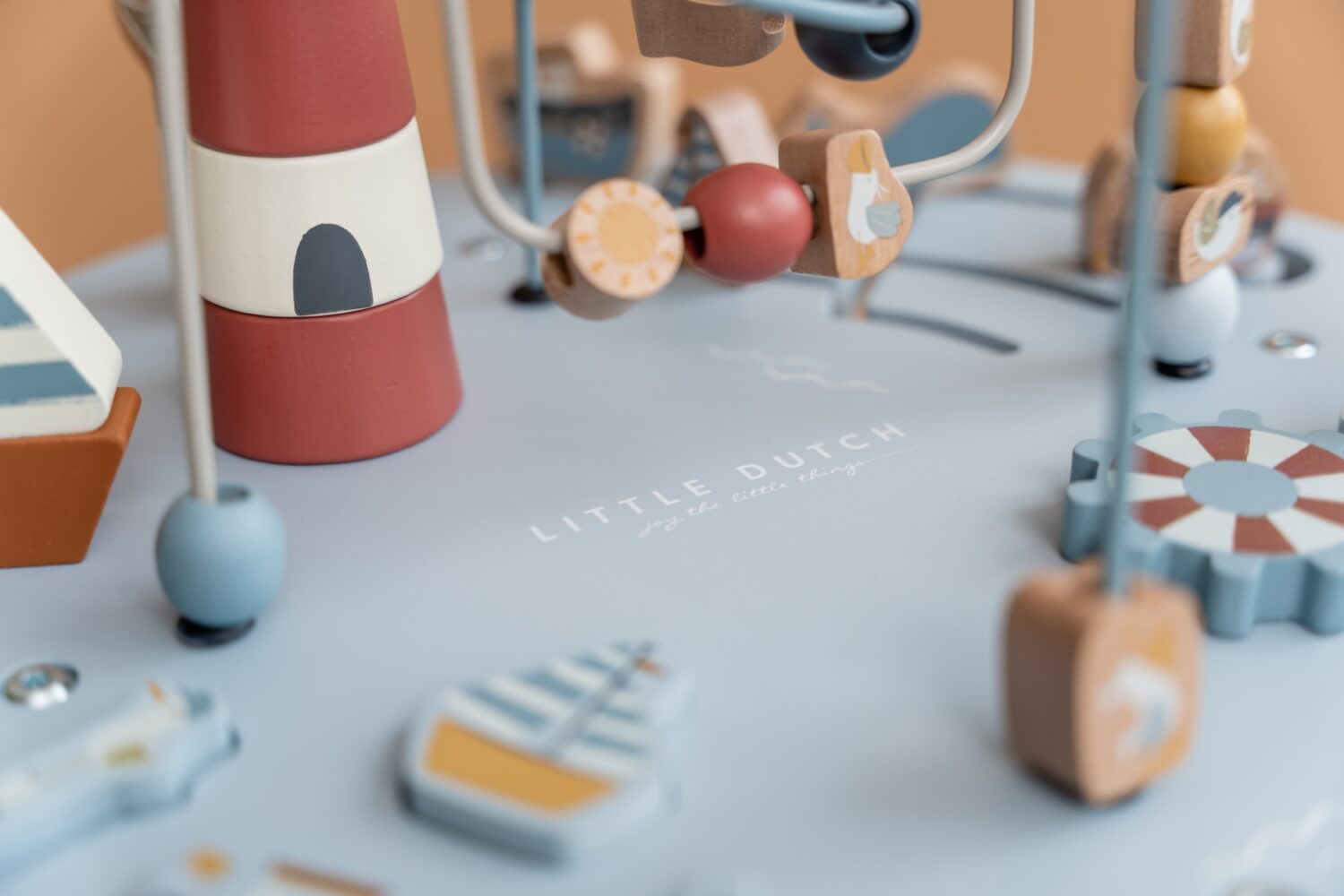Lève-toi et joue ! Découvre toutes les activités proposées sur cette table Little Dutch. Aide les mouettes à passer les perles de part et d’autre de la spirale. Ou construis un phare. Fais le puzzle, fais tourner les engrenages et navigue sur l’océan avec les petits bateaux. Avec cette table d’activités en bois, votre enfant a de nombreux défis à relever. Il y a 5 activités à découvrir, et chacune d’entre elles soutient le développement de la motricité fine. Grâce à la conception sûre et équilibrée, la table d’activités encourage également votre enfant à se lever. Et à rester debout ! Car toutes ces fonctions ludiques occuperont votre enfant pendant un bon moment.