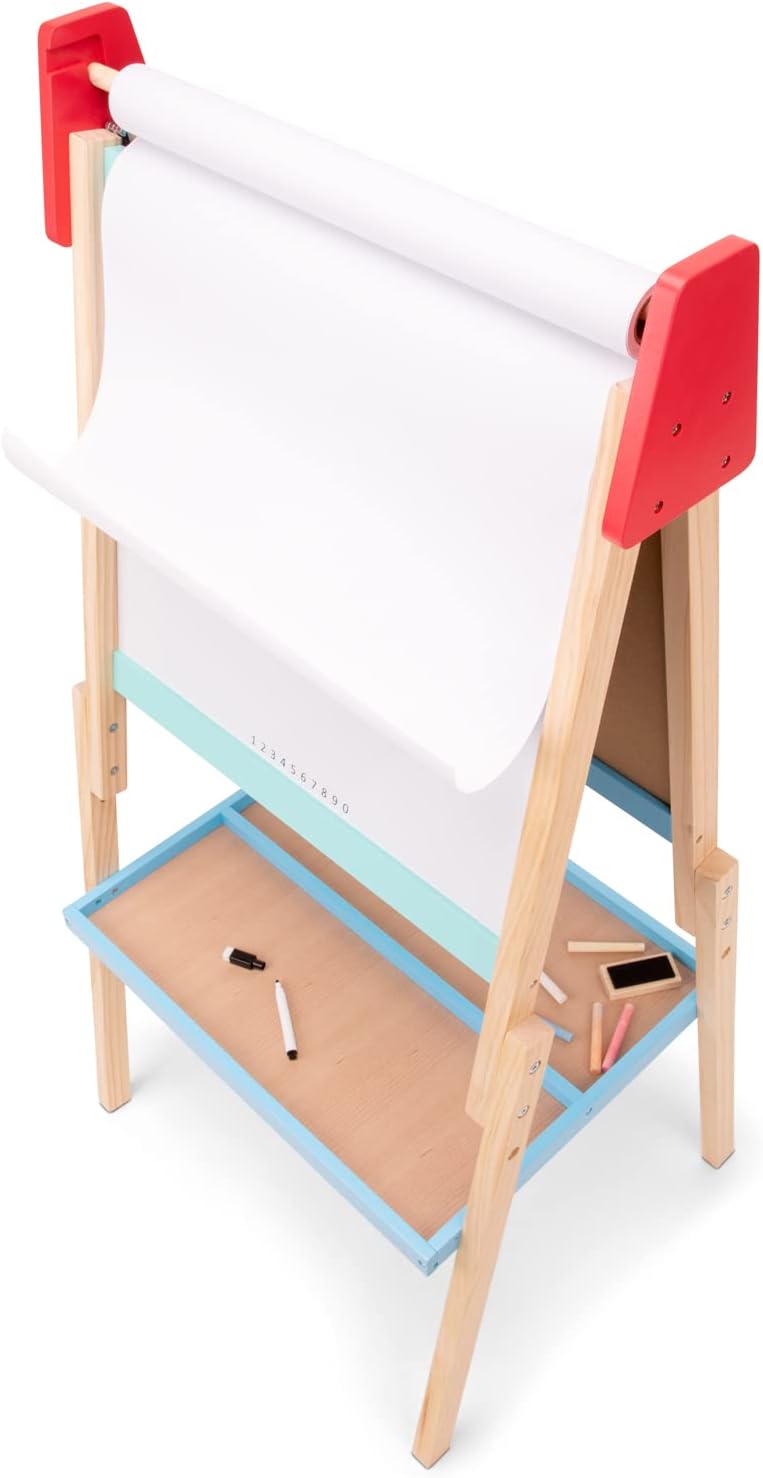 ll possède une face blanche magnétique qui permet d’écrire avec un feutre effaçable et de jouer avec des magnets par exemple et une face ardoise noire pour écrire à la craie. Les enfants pourront profiter de divers accessoires : craies, un feutre effaçable à sec, un rouleau de papier, une brosse à tableau .