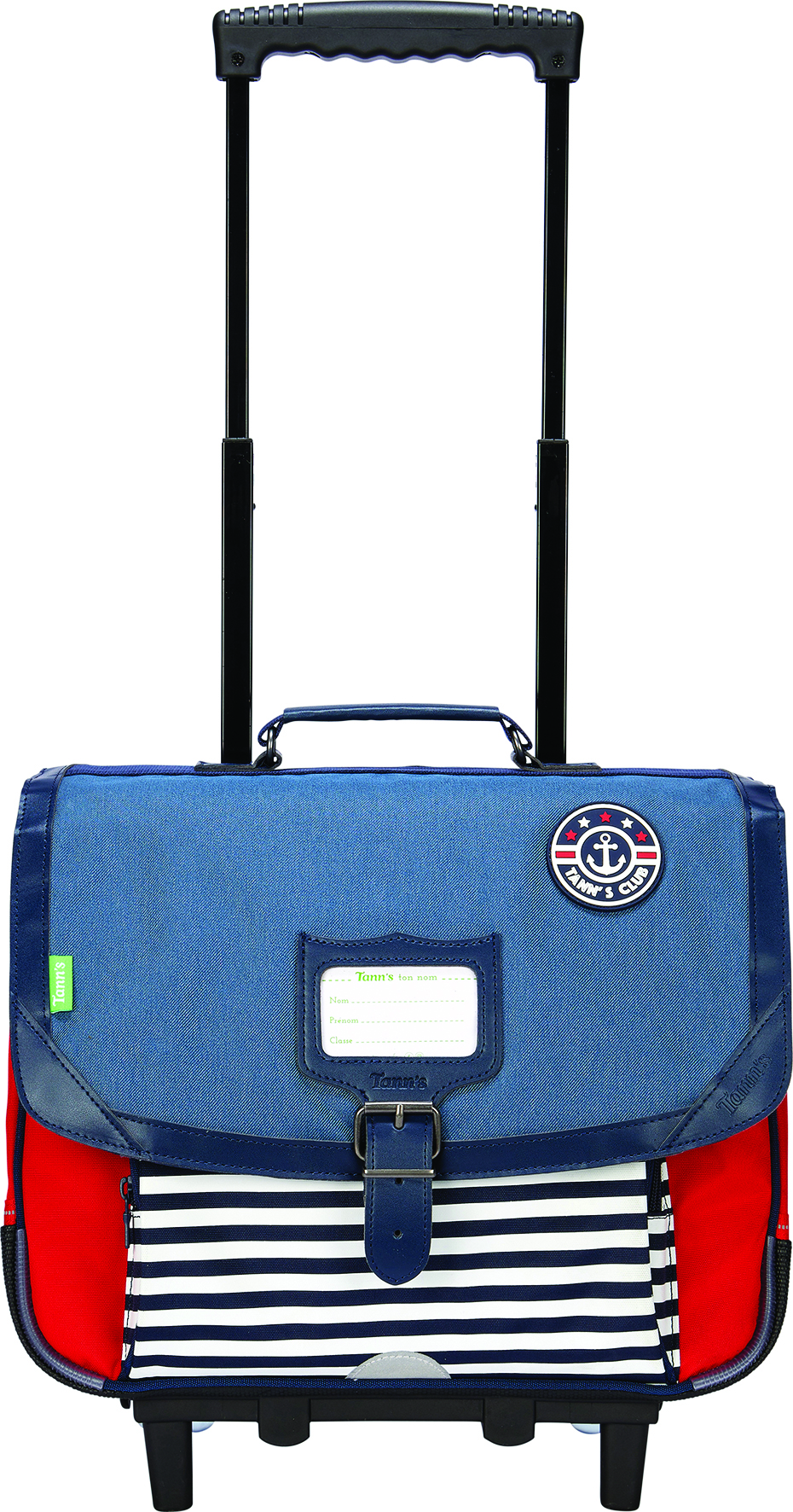 - Si vous avez le pied marin, levez l’ancre avec le cartable trolley Maxime et avec style grâce à sa matière aspect denim ornée d’un patch en gomme aux couleurs du Tann’s Club