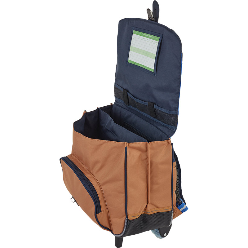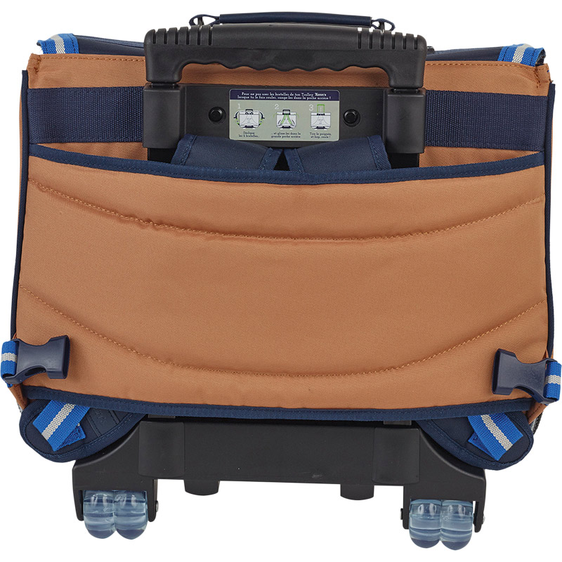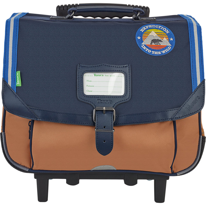 Le cartable trolley Loan associe deux coloris tendances : le marine et le camel. Associé à une ganse bi-matière dans les tons bleus et à un patch brodé sur le thème de l’aventure, il sera le chouchou des petits explorateurs.