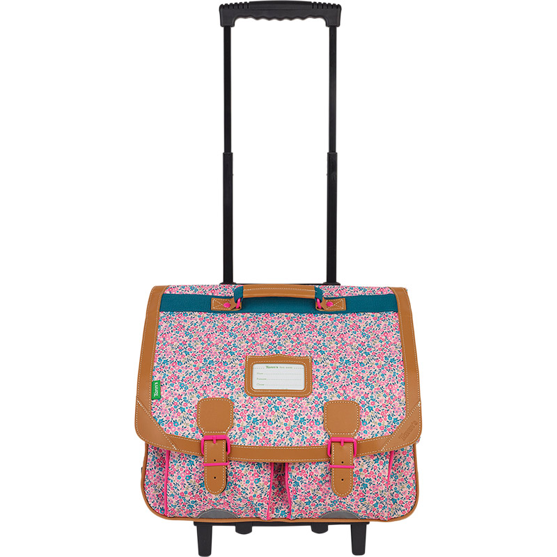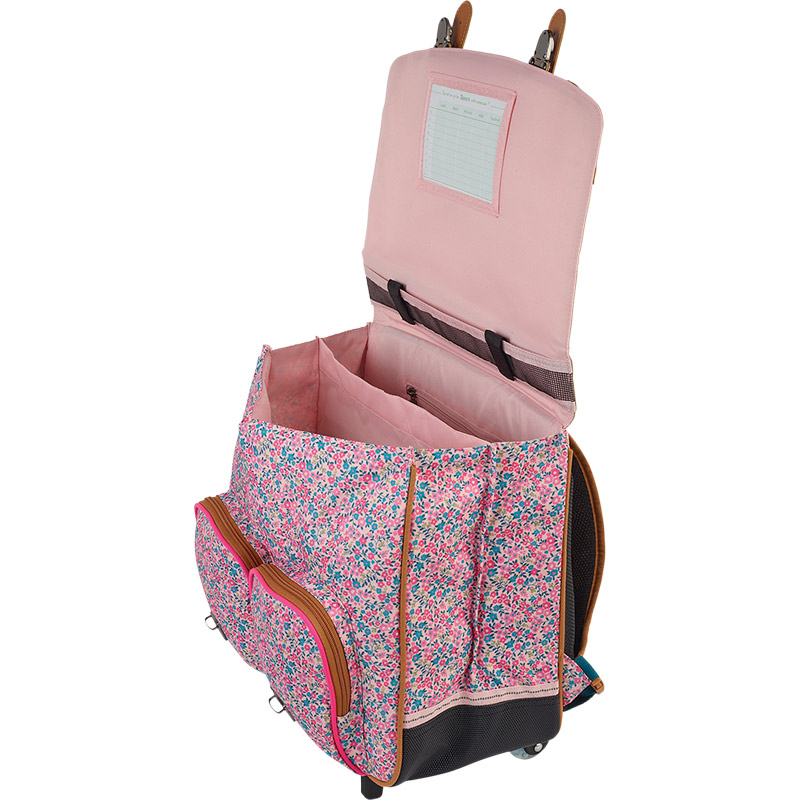 Voyez la vie en rose avec le modèle Victoria ! Le motif fleuri s’exprime à merveille en associant rose et turquoise. Pour apporter une touche de fantaisie et de modernité, les ornements de ce cartable trolley sont en rose fluo !